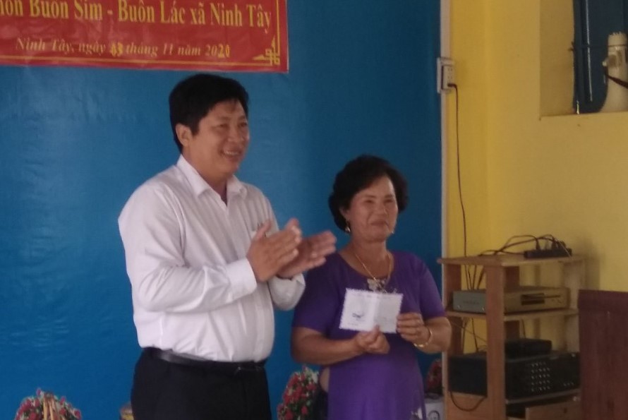 Đồng chí Cao Minh Thắng, Ủy viên Ban Thường vụ Thị ủy, Trưởng Ban Dân vận, Chủ tịch Ủy ban MTTQ Việt Nam thị xã tặng quà chúc mừng Ngày hội