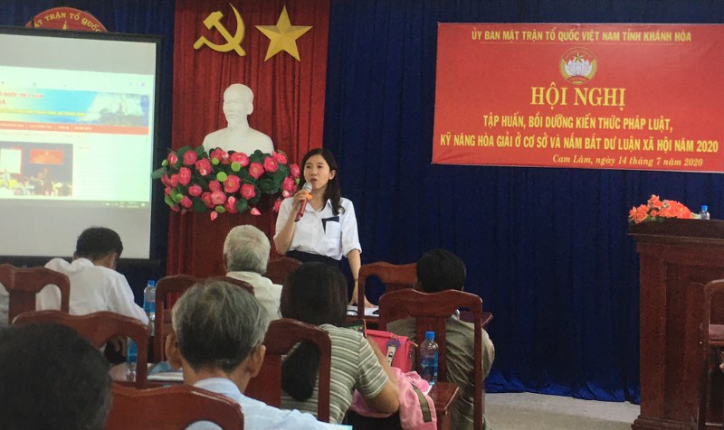 Sáng ngày 14/7/2020, tại Hội trường Mặt trận và các Đoàn thể huyện, Ủy ban MTTQ Việt Nam tỉnh Khánh Hòa phối hợp Ủy ban MTTQ Việt Nam huyện Cam Lâm tổ chức Hội nghị tập huấn bồi dưỡng kiến thức pháp luật, kỹ năng nghiệp vụ công tác hòa giải ở cơ sở cho 75 học viên là Trưởng Ban công tác Mặt trận và hòa giải viên cơ sở của các xã, thị trấn trên địa bàn huyện Cam Lâm.
