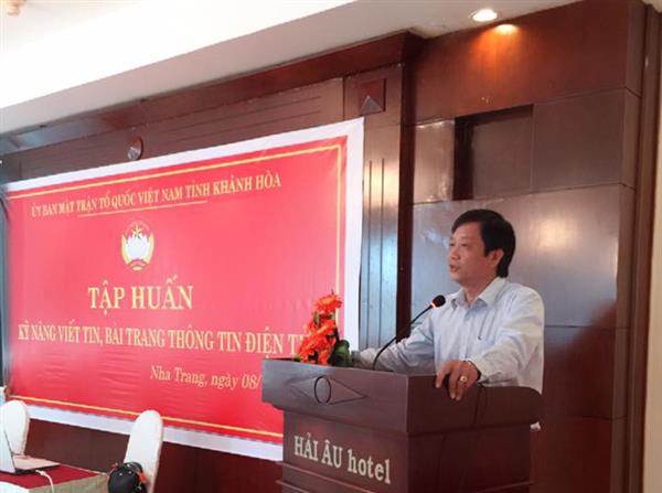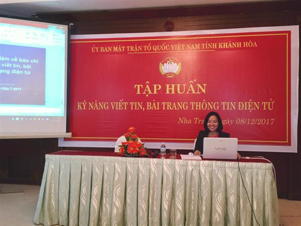 Ngày 8/12/2017, triển khai Đề án 01 về đổi mới công tác thông tin tuyên truyền trong hệ thống Mặt trận, Uỷ ban MTTQ tỉnh Khánh Hòa phối hợp với Báo Khánh Hòa tổ chức hội nghị tập huấn về quản lý, cung cấp, sử dụng thông tin, kỹ năng viết tin, bài trên trang thông tin điện tử Ủy ban MTTQ tỉnh trong hệ thống mặt trận. Đến dự có đồng chí Huỳnh Mộng Giang, Phó Chủ tịch Ủy ban MTTQ tỉnh và đồng chí Thái Thị Lệ Hằng- Phó Tổng biên tập Báo Khánh Hòa, báo cáo viên tại hội nghị.