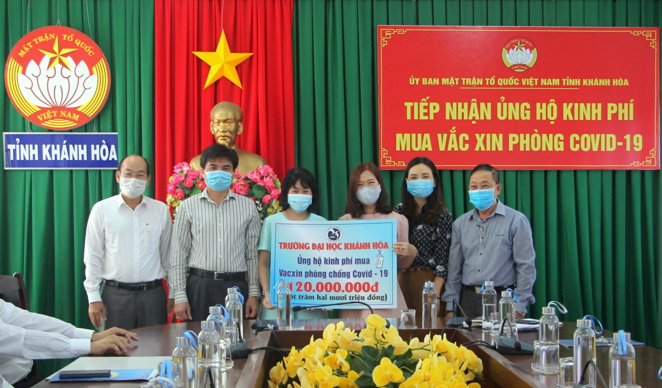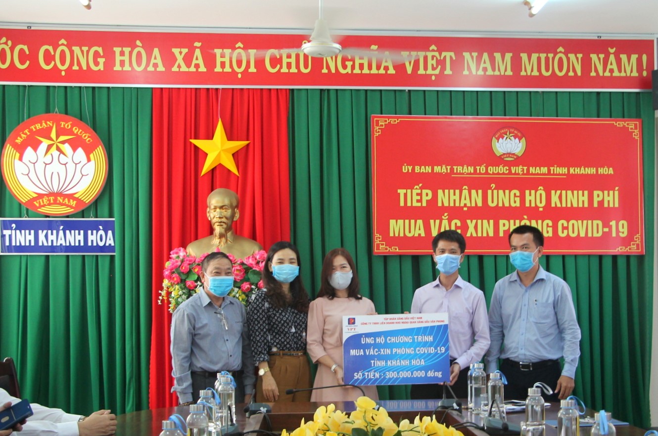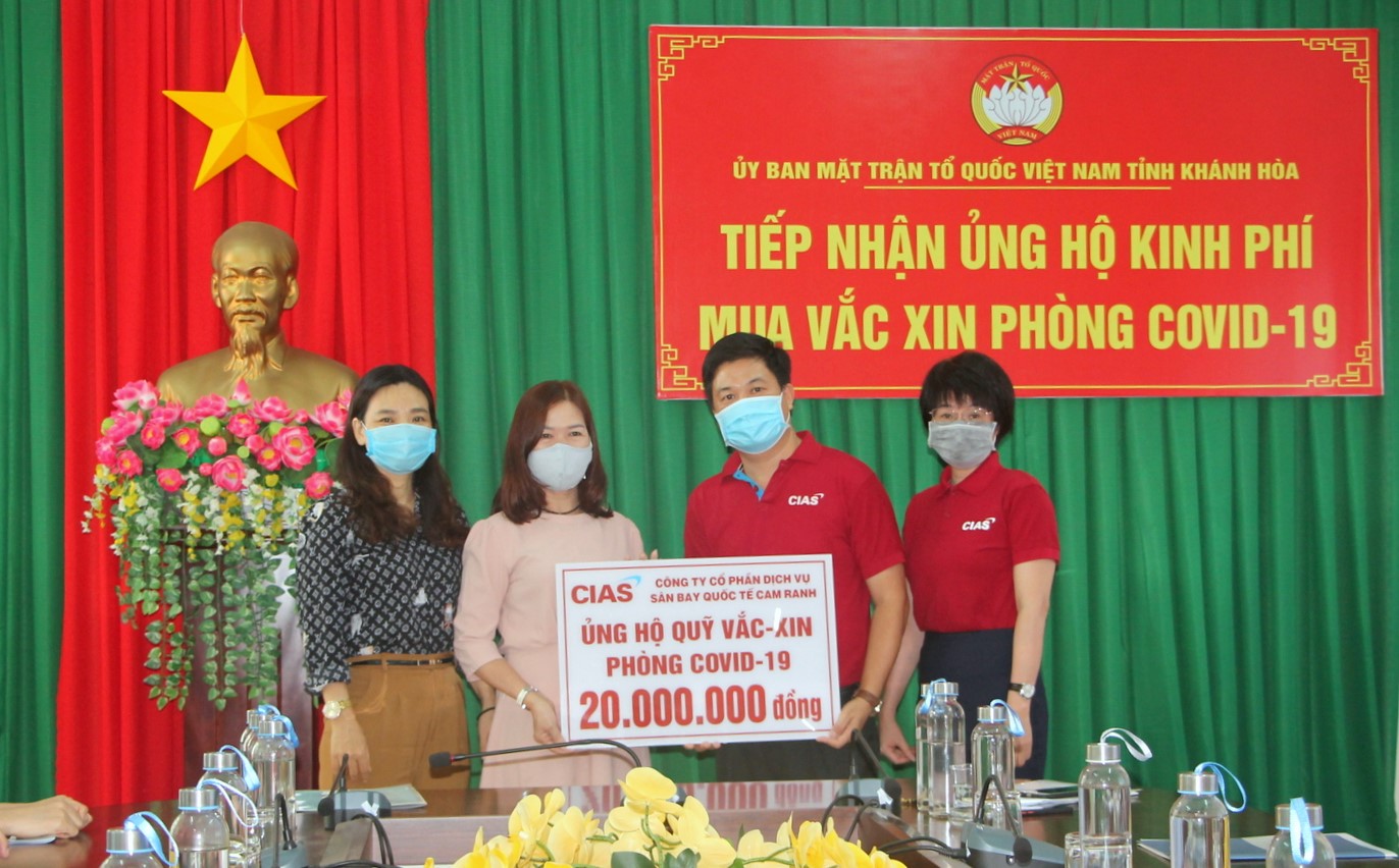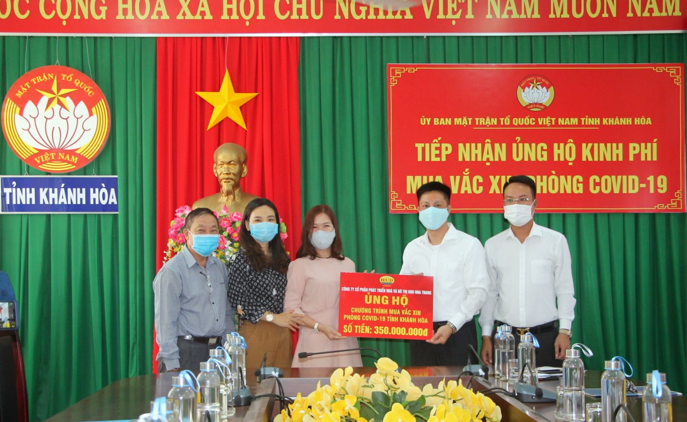 Tại buổi tiếp nhận, bà Huỳnh Thị Phượng – Phó Chủ tịch Ủy ban MTTQ Việt Nam tỉnh đã cảm ơn sự chung tay hỗ trợ kinh phí để tỉnh mua vắc xin tiêm phòng miễn phí cho người dân của cán bộ, nhân viên, người lao động của 7 doanh nghiệp, đơn vị gồm: Công ty Cổ phần Phát triển nhà và đô thị HUD Nha Trang: 350 triệu đồng; Công ty TNHH Liên doanh kho ngoại quan Xăng dầu Vân Phong: 300 triệu đồng; Công ty Cổ phần Khai thác Thủy điện sông Giang: 250 triệu đồng; Công ty Cổ phần T.D: 200 triệu đồng; Trường Đại học Khánh Hòa: 120 triệu đồng; Công ty TNHH Một thành viên Vận tải thương mại Huy Hoàng: 100 triệu đồng; Công ty Cổ phần Dịch vụ Sân bay Quốc tế Cam Ranh: 20 triệu đồng.