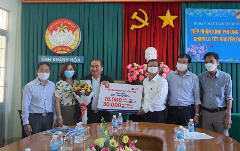 Chiều 11/1, Trung tâm Cứu trợ Covid-19 tỉnh Khánh Hòa tiếp nhận 40.000 khẩu trang ủng hộ cho công tác phòng, chống dịch của tỉnh từ Công ty Cổ phần Giấy Vĩnh Tiến, gồm: 10.000 khẩu trang bảo hộ; 30.000 khẩu trang KN95 với tổng trị giá gần 500 triệu đồng.