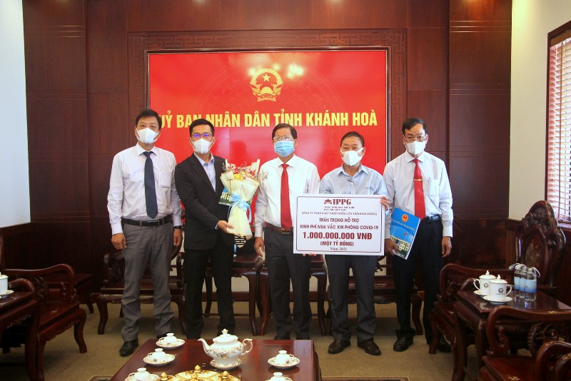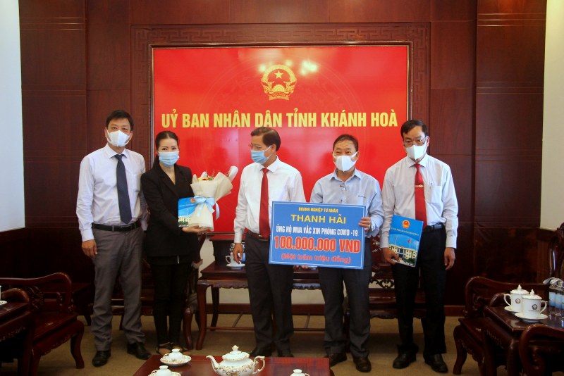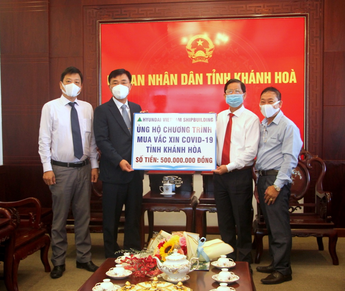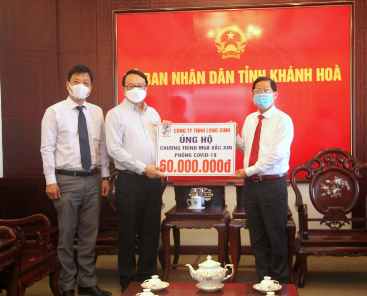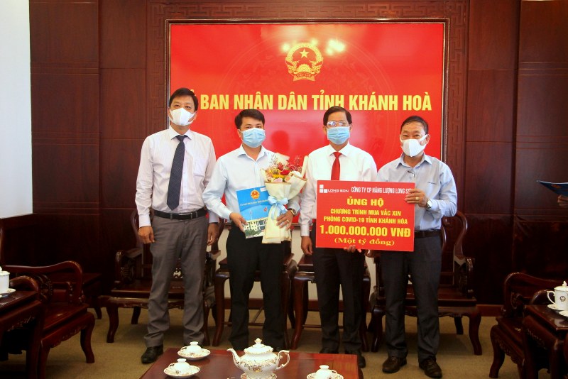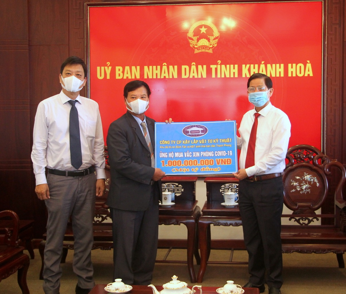 Tại buổi tiếp nhận, thay mặt Tỉnh ủy, HĐND, UBND, Ủy ban MTTQ Việt Nam tỉnh, ông Nguyễn Tấn Tuân - Phó Bí thư Tỉnh ủy, Chủ tịch UBND tỉnh và ông Huỳnh Mộng Giang - Phó Chủ tịch Ủy ban MTTQ Việt Nam tỉnh đã cảm ơn sự chia sẻ, hỗ trợ của cán bộ, nhân viên, người lao động của 6 doanh nghiệp gồm: Công ty Cổ phần Xây lắp Vật tư Kỹ thuật (ủng hộ 1 tỷ đồng); Công ty Cổ phần Năng lượng Long Sơn (ủng hộ 1 tỷ đồng); Công ty TNHH Xuất nhập khẩu Liên Thái Bình Dương (1 tỷ đồng); Công ty TNHH Đóng tàu Hyundai Việt Nam (ủng hộ 500 triệu đồng); doanh nghiệp tư nhân Thanh Hải, TP. Nha Trang (100 triệu đồng); Công ty TNHH Long Sinh (60 triệu đồng).