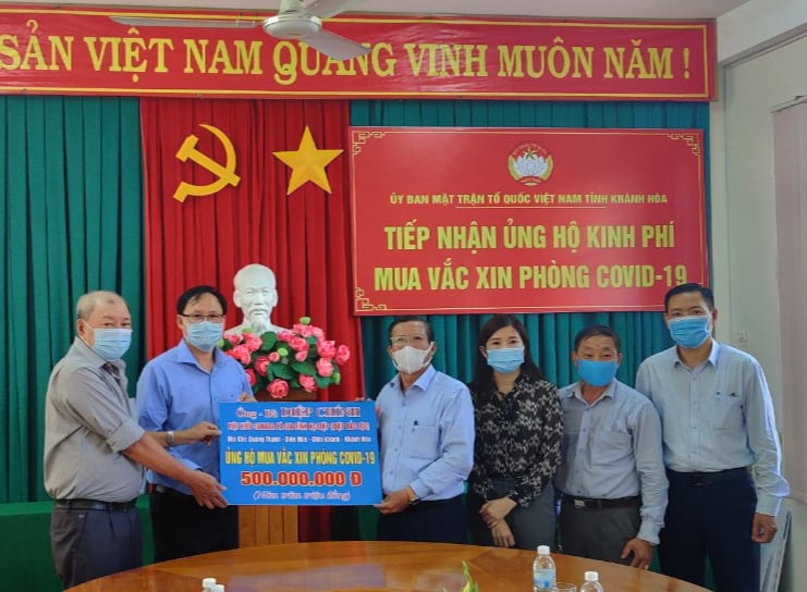 Chiều 11-5, Ủy ban MTTQ Việt Nam tỉnh đã tiếp nhận 500 triệu đồng ủng hộ mua vắc xin phòng Covid-19 từ đại diện gia đình ông, bà Diệp Chính (Việt kiều Canada), thôn Quang Thạnh, xã Diên Hòa, huyện Diên Khánh.