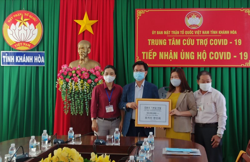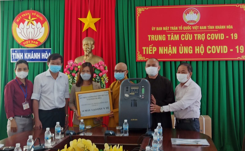 Chiều ngày 15/9, Bà Huỳnh Thị Phượng, Phó Chủ tịch Ủy ban Mặt trận Tổ quốc Việt Nam tỉnh, đại diện Trung tâm cứu trợ Covid-19 tỉnh đã tổ chức tiếp nhận trang thiết bị y tế và kinh phí từ các đơn vị, tổ chức hỗ trợ tỉnh phòng, chống dịch, gồm: Ban trị sự Giáo hội Phật giáo Việt Nam tỉnh ủng hộ 14 máy tạo oxy y tế trị giá 280 triệu (Hòa thượng Thích Nguyên Quang, Phó Ban Trị sự Giáo hội Phật giáo tỉnh đại diện trao tặng); Hội Hàn Kiều ủng hộ 50 triệu đồng (Ông Cho Kwangil đại diện trao tặng); Khối thi đua các cơ quan quản lý Tài chính tỉnh ủng hộ 35 triệu đồng (Bà Đỗ Thị Thu Trang, Phó Giám đốc Kho Bạc Nhà nước tỉnh Khánh Hòa đại diện trao tặng).