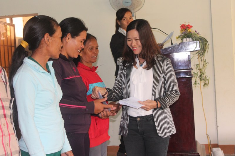 Bà Huỳnh Thị Phượng – Phó Chủ tịch Ủy ban MTTQ Việt Nam tỉnh (bìa phải) trao quà cho các già làng, trưởng bản có uy tín tiêu biểu tại