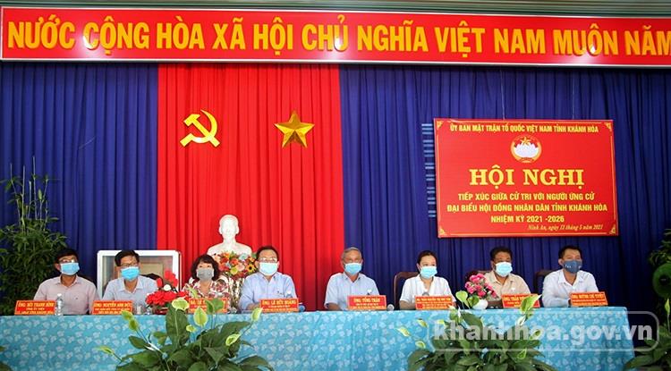 Theo đó, ông Nguyễn Tấn Tuân - Phó Bí thư Tỉnh ủy, Chủ tịch UBND tỉnh và các ứng cử viên đại biểu HĐND tỉnh thuộc Đơn vị bầu cử số 7 gồm các vị: Trần Thiện Phú Cường - Chánh Văn phòng HĐND, UBND thị xã Ninh Hòa; Đinh Văn Dũng - Chủ tịch Liên minh Hợp tác xã tỉnh; Nguyễn Thanh Hải - Tổng Giám đốc Công ty TNHH Nhà nước Một thành viên Yến sào Khánh Hòa; Đào Xuân Lân - Ủy viên Ban Thường vụ Tỉnh ủy, Giám đốc Công an tỉnh; Nguyễn Quỳnh Nga - Chủ tịch Hội Liên hiệp Phụ nữ tỉnh; Nguyễn Bửu Sơn - Phó Chủ tịch Thường trực, kiêm Tổng thư ký Liên hiệp các Hội Khoa học và Kỹ thuật tỉnh; Cù Thị Thanh Tuyền - giảng viên Trường Cao đẳng Y tế tỉnh đã đến tiếp xúc cử tri xã Ninh Hưng và xã Ninh Tân (thị xã Ninh Hòa).