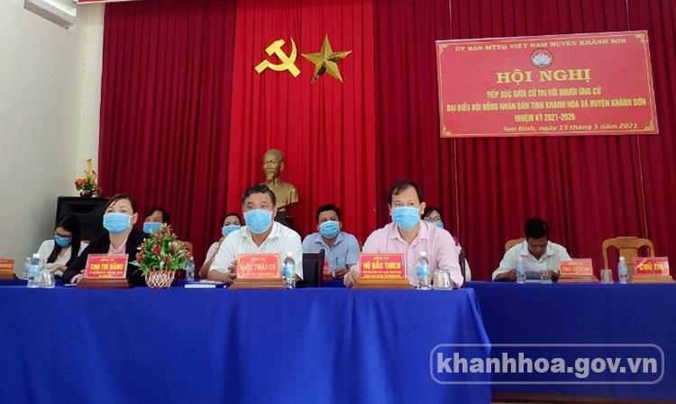 Các ứng cử viên đại biểu HĐND tỉnh thuộc Đơn vị bầu cử số 9 gồm các vị: Nguyễn Văn Bình - Trưởng phòng Công tác HĐND, Văn phòng Đoàn đại biểu Quốc hội và HĐND tỉnh; Mấu Văn Phi - Bí thư Huyện ủy Khánh Vĩnh; Lương Thị Thu Trang - chuyên viên Phòng Nội vụ huyện Khánh Vĩnh tiếp xúc cử tri xã Khánh Hiệp và xã Khánh Bình (huyện Khánh Vĩnh).