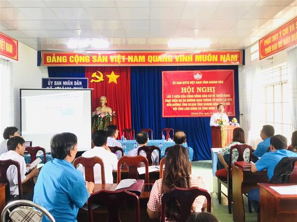 Trong ngày 23/11/2023, Ban Thường trực Ủy ban MTTQ Việt Nam tỉnh phối hợp với Ban quản lý dự án đầu tư xây dựng các công trình giao thông tỉnh Khánh Hòa tổ chức lấy ý kiến cộng đồng dân cư bị ảnh hưởng trực tiếp của dự án đường Giao thông từ Quốc lộ 27C đến đường tỉnh ĐT.656 tỉnh Khánh Hòa kết nối với tỉnh Lâm Đồng và tỉnh Ninh Thuận tại 02 xã Khánh Phú, Sông Cầu thuộc huyện Khánh Vĩnh.