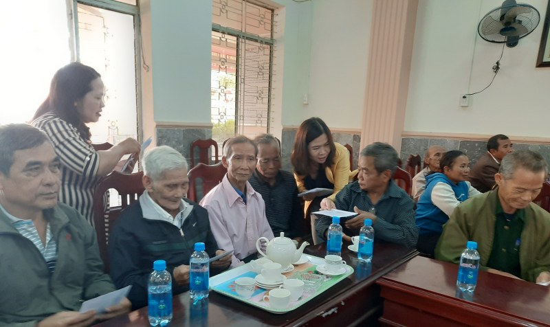 Đồng chí Huỳnh Thị Phượng và đồng chí Cao Thị Thêm tặng quà các già làng, các vị uy tín