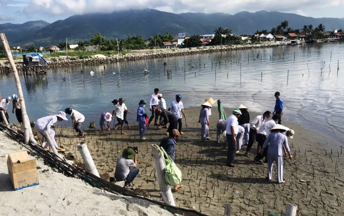 Phật tử chùa Hải Giác và người dân thôn Hải Triều trồng cây đước con dọc bờ biển