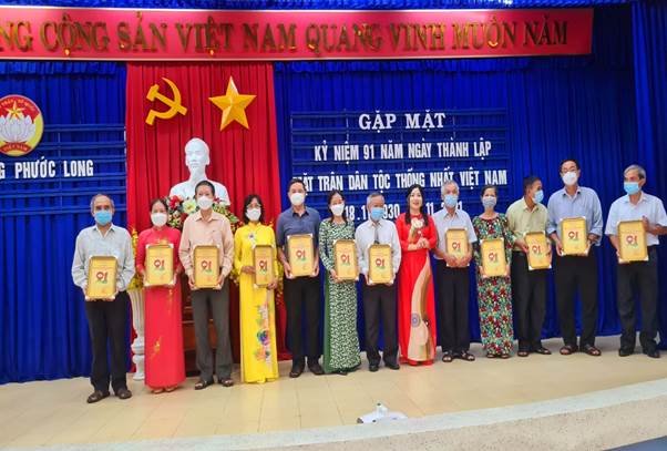 Tại buổi gặp mặt các đại biểu đã cùng nhau ôn lại lịch sử vẻ vang của Mặt trận tổ quốc Việt Nam 91 năm qua; phát huy truyền thống đó trong những năm qua Mặt trận phường Phước Long đã góp phần cùng cấp ủy, chính quyền địa phương thực hiện có hiệu quả các phong trào thi đua yêu nước và cuộc vận động; thực hiện tốt quyền làm chủ của nhân dân, tích cực tham gia xây dựng Đảng, chính quyền vững mạnh.Thực hiện Cuộc vận động “Toàn dân đoàn kết xây dựng nông thôn mới- Đô thị văn minh”năm 2021. Các ban CTMT đã xây dựng 17 mô hình về “xây dựng tuyến đường Ban công tác mặt trận”, “tự quản về vệ sinh môi trường”, “tăng cường quan hệ mật thiết giữa cấp ủy mặt trận và các chức sắc tôn giáo”, “Mô hình bảo hệ thống loa truyền thanh nội bộ”,” Tuyên truyền các hộ không buôn bán lấn chiếm lòng lề đường”… thông qua các mô hình góp phần xây dựng tổ dân phố xanh, sạch, đẹp, đường phố khang trang, ý thức của cộng đồng dân cư được nâng lên một bước, góp phần cải tiến đời sống tinh thần cho Nhân dân. Mặt trận phối hợp với Tổ dân phố, đoàn thể hội vận động 100% hộ dân đăng ký xây dựng đạt văn hóa, có 20/20 tổ đăng ký phấn đấu giữ vững tổ dân phố văn hóa.