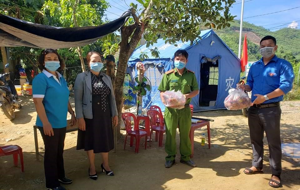 Đồng chí Cao Thị Thêm (áo xám) tặng quà động viên chốt kiểm soát dịch Covid-19