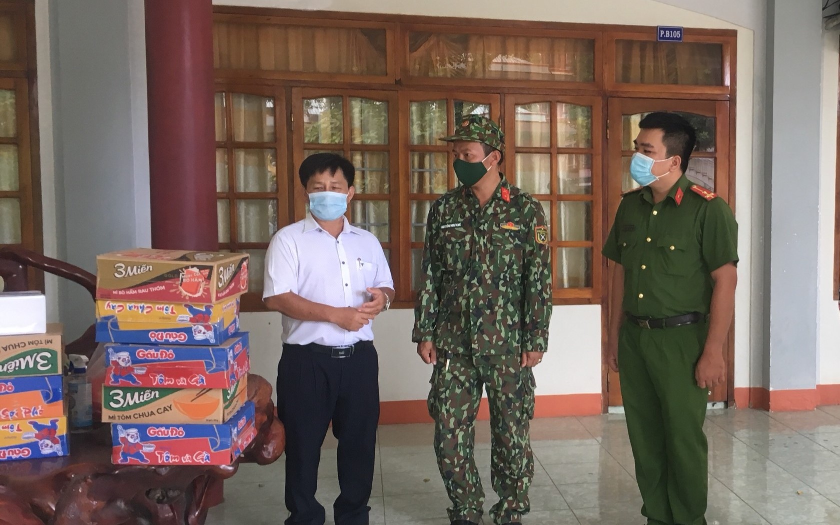 Ông Trần Khánh Hòa (ngoài cùng bên trái) thăm hỏi, trao quà cho lực lượng trực tại khu vực cách ly tập trung