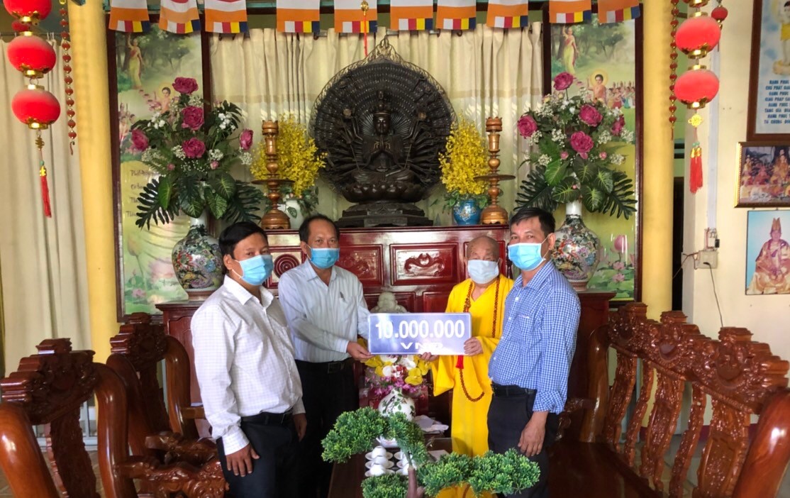 Ông Nguyễn Phước Đàn - Phó Chủ tịch Ủy ban MTTQ Việt Nam huyện (thứ 2, bên trái) tiếp nhận hỗ trợ từ chùa Minh Quang-Thiện Phước