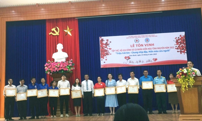 Trong dịp này có 23 tập thể, 07 hộ gia đình và 43 cá nhân có thành tích xuất sắc trong phong trào HMTN được UBND thành phố Cam Ranh tặng Giấy khen. Ngoài ra, Ban Chỉ đạo HMTN thành phố đã trình BCĐ HMTN tỉnh, đề nghị Thủ tướng Chính phủ tặng Bằng khen cho 01 hộ gia đình tham gia hiến máu từ 70 lần trở lên; trình Trung ương Hội Chữ thập đỏ Việt Nam tặng Kỷ niệm chương cho 02 cá nhân; cử 01 đại biểu tiêu biểu là hội viên Chữ thập đỏ xã Cam Lập, đã tham gia HMTN trên 50 lần và đại diện hộ gia đình hiến máu trên 90 lần, đi dự Chương trình tôn vinh 100 người HMTN tiêu biểu cấp Quốc gia, được tổ chức tại Hà Nội vào cuối tháng 6/2022.