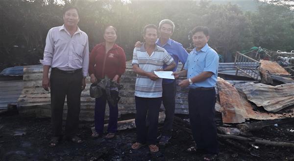 Ông Trần Khánh Hòa (ngoài cùng bên phải) trao hỗ trợ cho gia đình bị cháy nhà