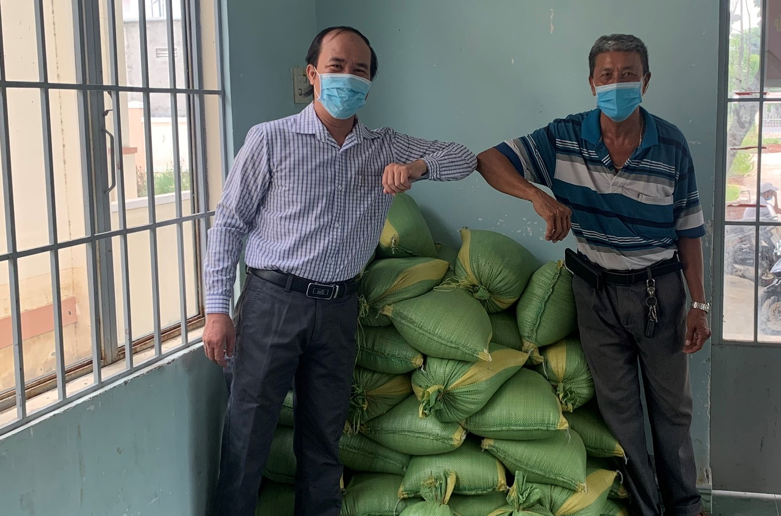 Ông Nguyễn Nam Lương (bên trái) - Chủ tịch Ủy ban MTTQ Việt Nam xã tiếp nhận gạo của mạnh thường quân