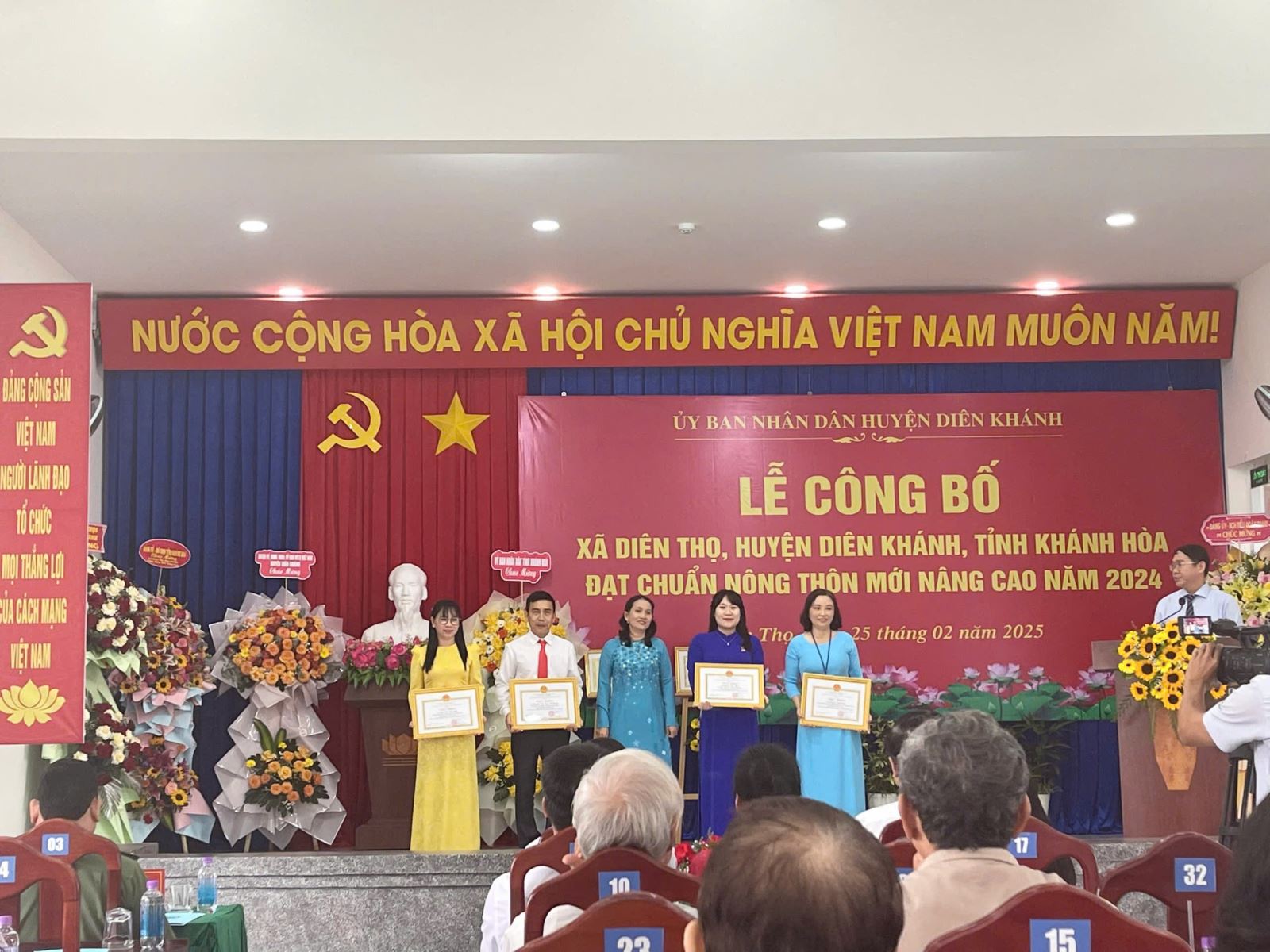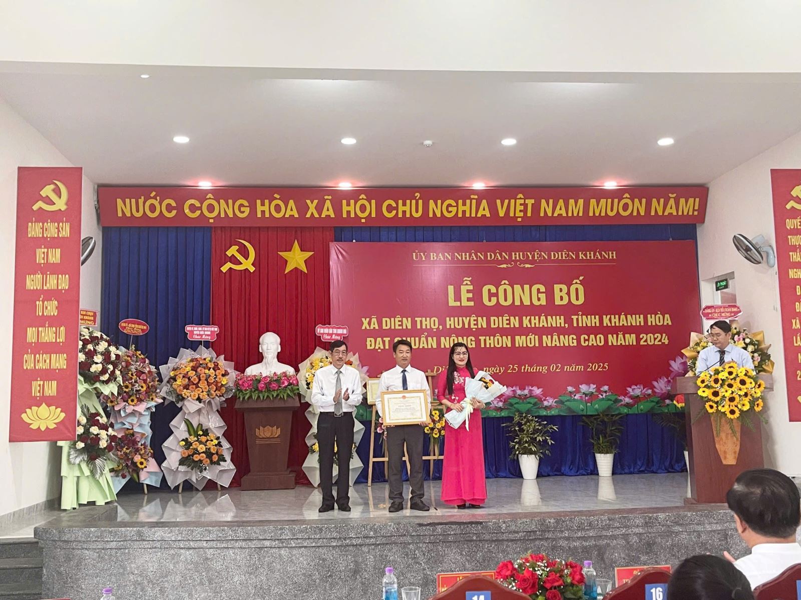 Sáng 25/02, tại Hội trường UBND xã Diên Thọ long trọng tổ chức Lễ công bố đạt chuẩn Nông thôn mới (NTM) nâng cao năm 2024. Tham dự, có ông Lê Bá Ninh - Phó Giám đốc Sở Nông nghiệp và Môi trường tỉnh Khánh Hòa, Văn phòng điều phối nông thôn mới tỉnh, Ông Trần Văn Kính- Phó Bí thư thường trực Huyện ủy, Chủ tịch HĐND huyện Diên Khánh, Bà Nguyển Thị Kim Hương, Ủy viên Ban thường vụ huyện ủy, Phó Chủ tịch UBND huyện Diên Khánh, Lãnh đạo các phòng ban tham mưu của huyện, Lãnh đạo Đảng ủy, HĐND, UBND, UBMTTQVN xã, các thành viên Ban chỉ đạo nông thôn mới và Nhân dân tiêu biểu của xã Diên Thọ.