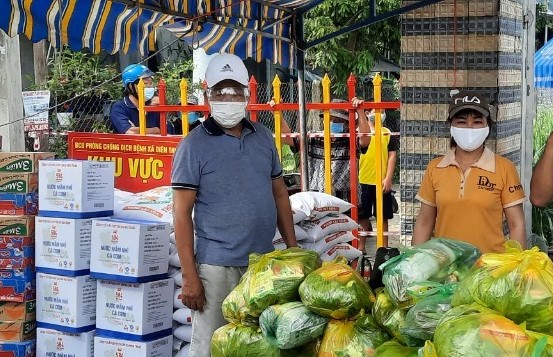 Bà Trần Thị Kim Yến-Chủ tịch Ủy ban MTTQ Việt Nam xã phân bổ và phát quả hỗ trợ cho Nhân dân khu cách ly, phong tỏa phòng chống dịch bệnh Covid- 19