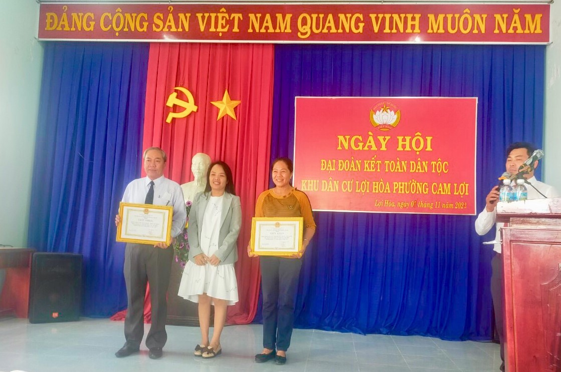Dịp này, UBMTTQ Việt Nam Phường, UBND Phường Cam Lợi khen thưởng 01 tập thể, 01 cá nhân có thành tích xuất sắc, tiêu biểu trong thực hiện các cuộc vận động, các phong trào thi đua yêu nước và có nhiều đóng góp cho các hoạt động an sinh xã hội ở địa phương. Phát biểu tại ngày hội, đồng chí Trần Văn Thịnh vui mừng trước những kết quả đạt được của Chi bộ, chính quyền và bà con Nhân dân Phường nói chung, khu dân cư Lợi Hòa nói riêng trong công tác đoàn kết, tập hợp Nhân dân thực hiện các phong trào hành động cách mạng ở địa phương.