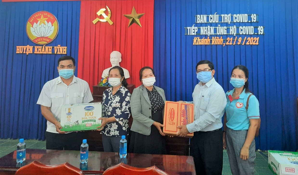 Nhằm chia sẻ những hoàn cảnh khó khăn các trường hợp nhiễm Covid-19 và lực lượng phòng, chống dịch trên địa bàn huyện, Đoàn từ thiện Hân Châu Nha Trang đã tặng 166 suất gồm bánh mì, sữa, mì tôm, trứng, nước mắm, tổng trị giá 12.625.000đ; Đoàn Tâm Đức đã trao 2200 hộp sữa, 90 thùng mì tôm trị giá 15.240.000đ.