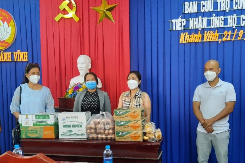 Tại các buổi tiếp nhận có đồng chí Cao Thị Thêm - Ủy viên Ban Thường vụ Huyện ủy, Trưởng Ban Dân vận, Chủ tịch Ủy ban Mặt trận TQVN huyện, Trưởng Ban cứu trợ Covid-19 huyện Khánh Vĩnh; các thành viên đoàn từ thiện: Đoàn Hân Châu; Đoàn Tâm Đức tại thành phố Nha Trang.