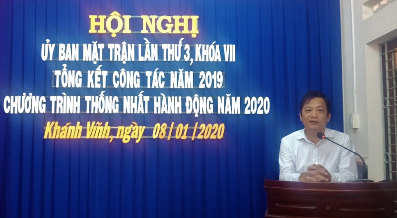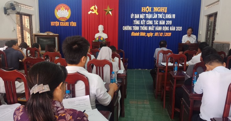 Sáng ngày 08-01, Ủy ban MTTQ Việt Nam huyện Khánh Vĩnh tổ chức tổ chức Hội nghị Tổng kết công tác Mặt trận năm 2019 và Chương trình thống nhất hành động năm 2020. Đến dự có đồng chí Huỳnh Mộng Giang– Phó Chủ tịch UBMT tỉnh; đồng chí Cao Cường – Tỉnh ủy viên, Bí thư Huyện ủy; đồng chí Cao Thị Ánh – Phó Ban Dân vận Huyện ủy; đồng chí Nguyễn Văn Thuận – Phó Chủ tịch UBND huyện; đồng chí Cao Thị Thêm – Chủ tịch UBMT huyện; các đồng chí Trưởng Ban Tuyên giáo; Trưởng Ban Dân tộc – Tôn giáo UBMT Tỉnh; các đồng chí trong Ban Thường trực UBMT huyện; đại diện các Ban ngành, đoàn thể; các vị Ủy viên UBMT huyện.