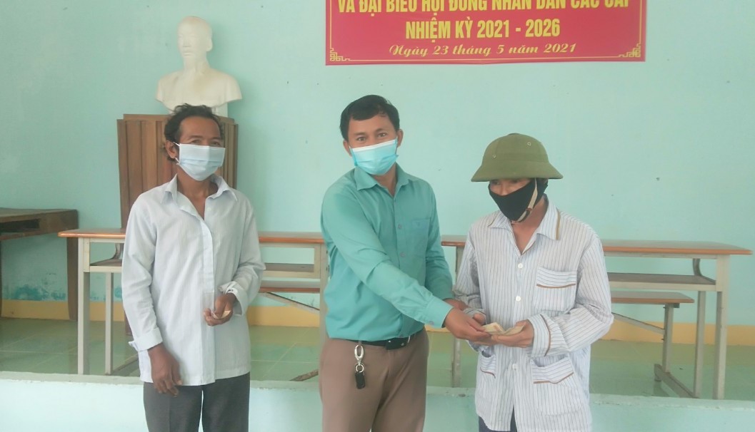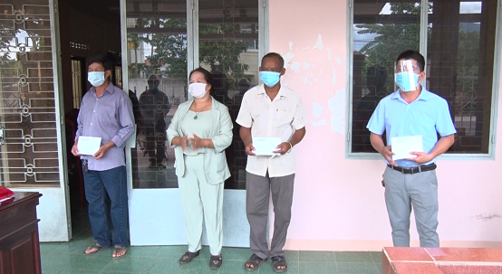Đồng chí Cao Diện – Chủ tịch UBMT xã Khánh Hiệp trao tiền hỗ trợ cho các hộ nghèo có hoàn cảnh khó khăn do dịch Covid-19 cho các xã, thị trấn