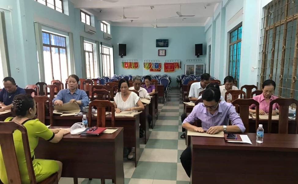 Bà Nguyễn Thị Cẩm Nhung – Chủ tịch UBMTTQVN phường đang hướng dẫn các Ban công tác Mặt trận cách làm túi giấy