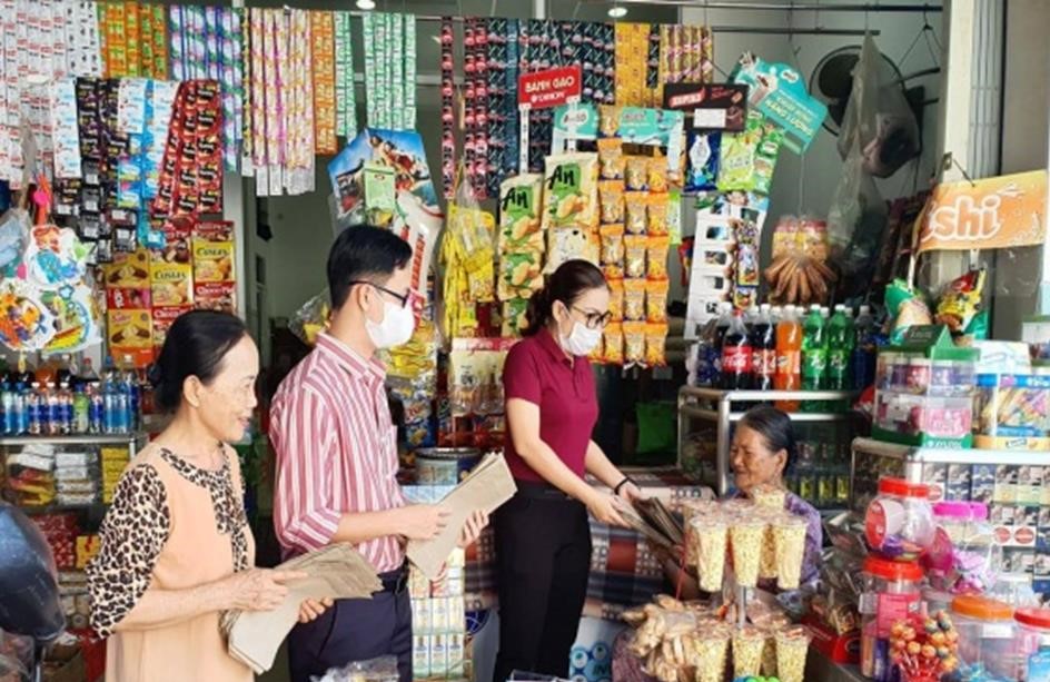 Bà Nguyễn Thị Cẩm Nhung cùng Đoàn TN và Ban CTMT tuyên truyền, hướng dẫn các tiểu thương làm và sử dụng túi giấy