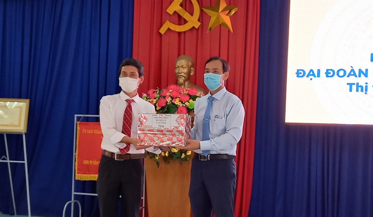 Ông Thạch Nguyễn Mai Thiện Bảo - Chủ tịch Mặt trận thị trấn (bên trái) nhận quà chúc mừng Ngày hội