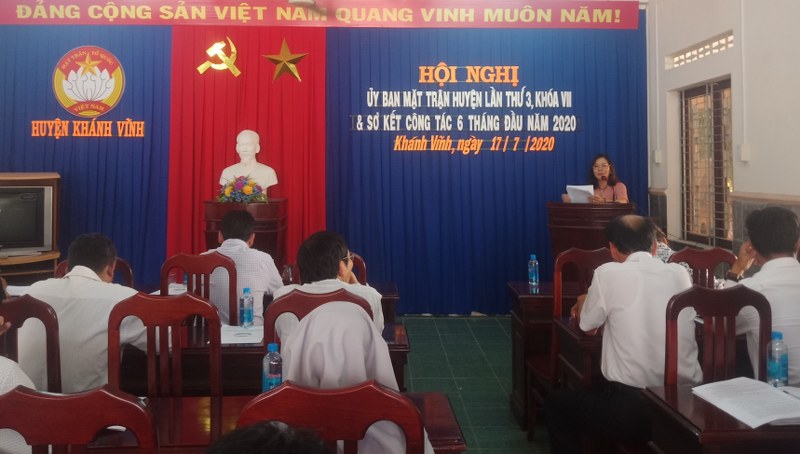 Nhằm đánh giá kết quả công tác Mặt trận 6 tháng đầu năm, đề ra Chương trình phối hợp và thống nhất hành động 6 tháng cuối năm 2020, sáng ngày 17/7/2020 Ủy ban Mặt trận (UBMT) TQVN huyện Khánh Vĩnh tổ chức hội nghị lần thứ 3 nhiệm kỳ 2019 – 2024. Đến dự và chỉ đạo Hội nghị có các đồng chí: Huỳnh Thị Phượng – Phó Chủ tịch UBMT tỉnh Khánh Hòa; Mấu Văn Phi – Phó Bí thư Thường trực Huyện ủy; Cao Thị Ánh – Phó Ban dân vận Huyện; Cao Thị Thêm – Ủy viên Ban Thường vụ Huyện ủy - Chủ tịch UBMT huyện và các đồng chí Ủy viên Ủy ban MTTQ huyện nhiệm kỳ 2019 – 2024.
