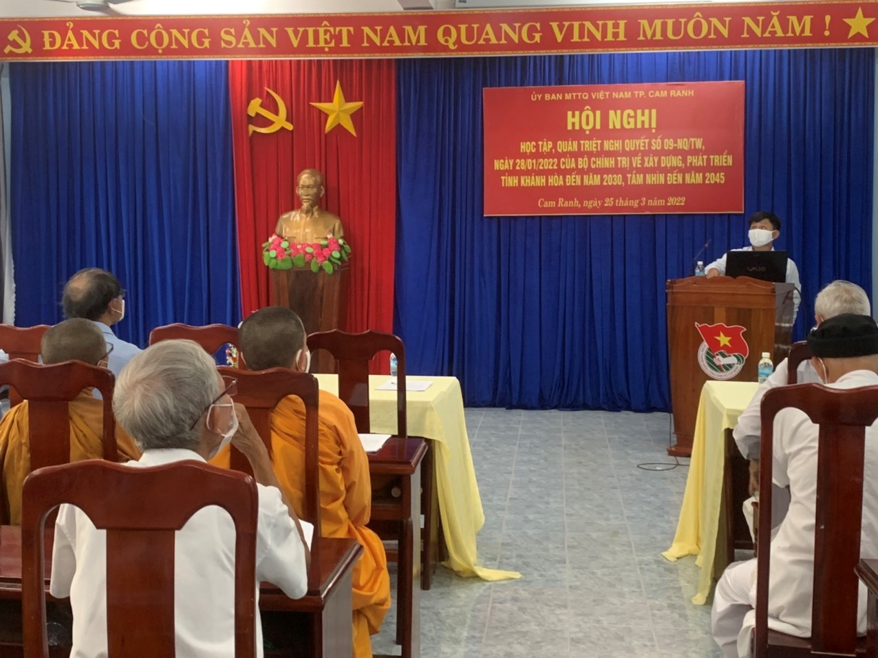 Chiều 25/3/2022, tại Hội trường Ủy ban MTTQ Việt Nam thành phố, Ban Thường trực Ủy ban MTTQ Việt Nam thành phố Cam Ranh đã tổ chức Hội nghị học tập, quán triệt, tuyên truyền Nghị quyết số 09-NQ/TW, ngày 28/01/2022 của Bộ Chính trị và Chương trình hành động số 30-CTr/TU, ngày 23/02/2022 của Ban Chấp hành Đảng bộ tỉnh Khánh Hòa về thực hiện Nghị quyết số 09 về xây dựng, phát triển tỉnh Khánh Hòa đến năm 2030, tầm nhìn đến năm 2045 cho các vị Ủy viên Ủy ban MTTQ Việt Nam thành phố; các vị chức sắc các tôn giáo; lãnh đạo các tổ chức hội quần chúng; Chủ tịch, Phó Chủ tịch Mặt trận các xã, phường và các vị Già làng, người có uy tín trong đồng bào dân tộc thiểu số trên địa bàn thành phố.