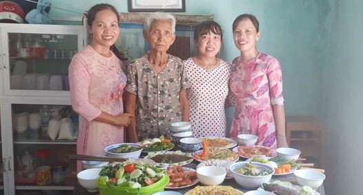Thường trực MTTQVN xã và gia đình bà Nguyễn Thị Ngâm bên mâm cơm