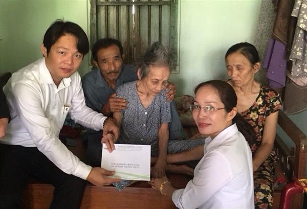 Đại diện Ban lãnh đạo Chi nhánh Ngân hàng Vietcombank hỗ trợ tiền cho hộ gia đình