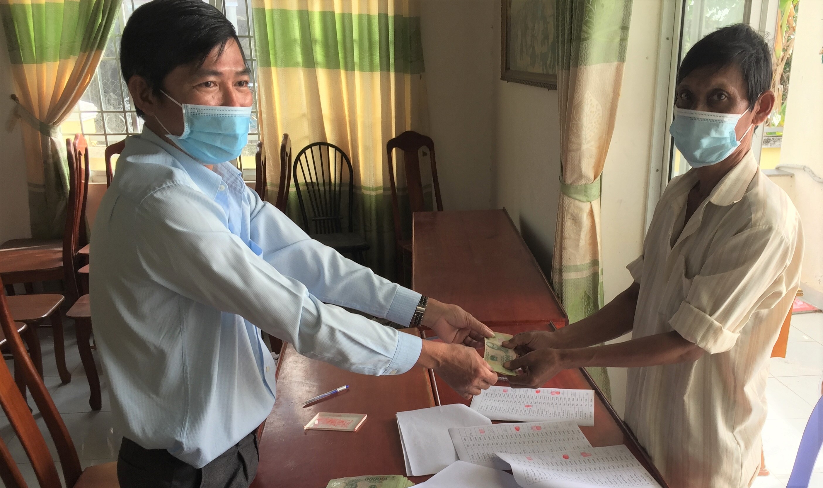 Ông Mai Tấn Hiệp – CT.UBMT xã (bên trái) trao tiền hỗ trợ cho người dân