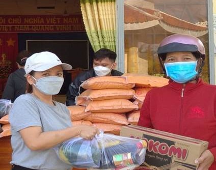 Bà Nguyễn Thị Tuyết Nga, Chủ tịch MTTQ Việt Nam xã (bên trái) trao quà hỗ trợ