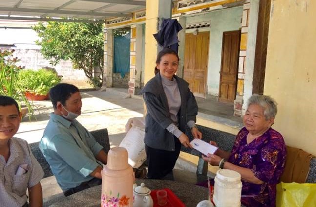 Đại diện BTT Ủy ban MTTQ xã tặng quà gia đình Bà Lê Thị Miếng
