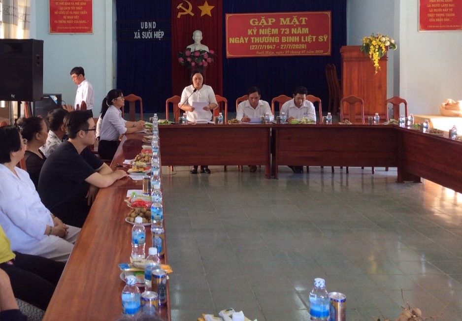Nhân kỷ niệm 73 năm ngày Thương binh Liệt sĩ (27/7/1947-27/7/2020), nhằm ôn lại truyền thống đấu tranh hào hùng của dân tộc, đồng thời thực hiện tốt công tác đền ơn đáp nghĩa của Đảng và Nhà nước, sáng ngày 27/7/2020 Đảng ủy-HĐND-UBND-Ủy ban MTTQ Việt Nam xã Suối Hiệp tổ chức buổi gặp mặt các đồng chí thương binh, bệnh binh, các đồng chí tham gia kháng chiến bị nhiễm chất độc hóa học, gia đình có công với Cách mạng, các thân nhân thờ cúng Liệt sĩ, Bà mẹ Việt Nam anh hùng của địa bàn xã Suối Hiệp, huyện Diên Khánh. Đồng thời, trao tặng 96 phần quà của Trung Ương và của Tỉnh, mỗi phần trị giá 200.000 đồng.