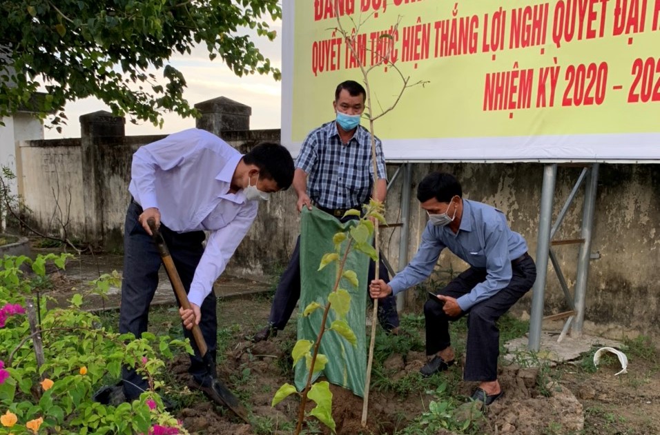 Ông Nguyễn Văn Đức – UV. BTV Đảng ủy - chủ tịch UBMTTQ Việt Nam xã (áo trắng bên trái) trồng cây trước UBND xã Vạn Phước