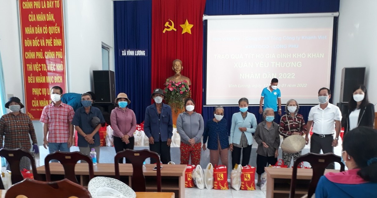 Sáng ngày 17/1/2022, Ủy ban Mặt trận xã Vĩnh Lương phối hợp cùng đơn vị tài trợ là Công đoàn Tổng Công ty Khánh Việt tổ chức buổi trao quà tết cho các gia đình hộ nghèo, hộ có hoàn cảnh khó khăn trên địa bàn xã nhân dịp đón Tết Nguyên đán Nhâm Dần 2022.
