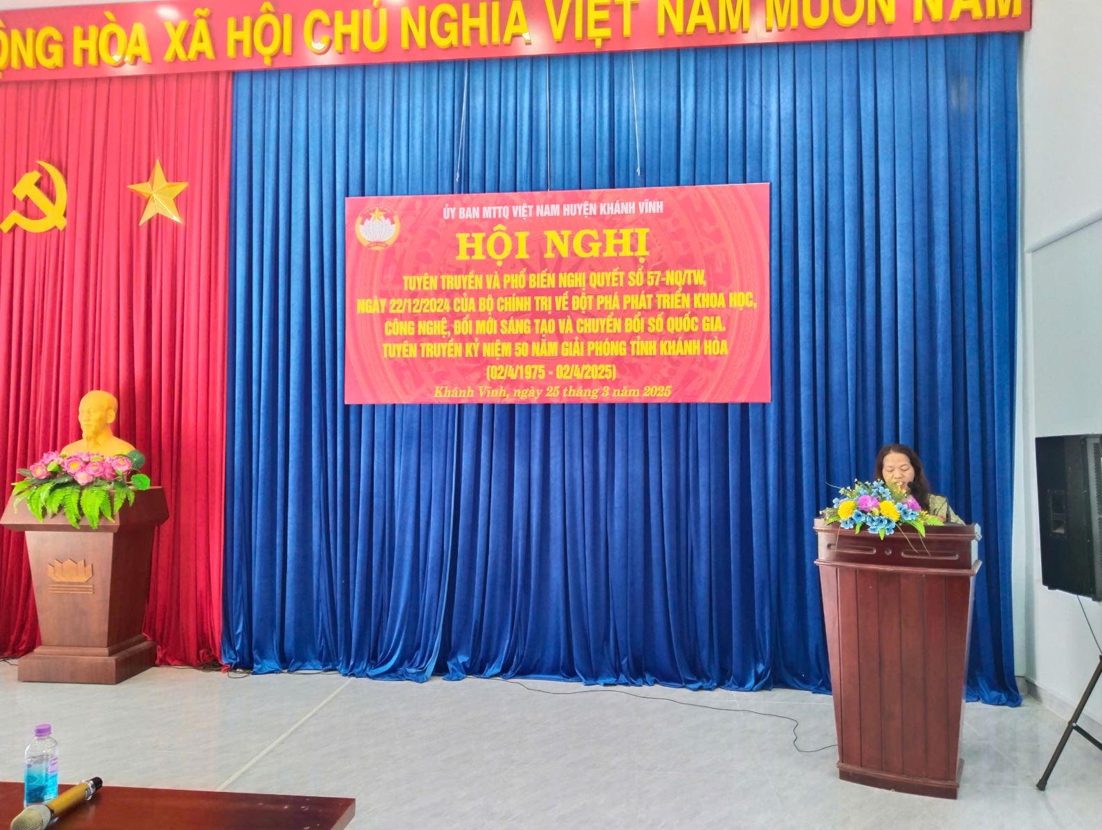 Qua buổi tuyên truyền xác định nhiệm vụ của các ban ngành, tổ chức chính trị - xã hội; tuyên truyền, phổ biến đầy đủ, kịp thời các quan điểm, định hướng, mục tiêu, nhiệm vụ đưa khoa học, công nghệ, đổi mới sáng tạo và chuyển đổi số quốc gia là đột phá quan trọng hàng đầu, là động lực chính để phát triển nhanh, phát triển kinh tế - xã hội bền vững, ngăn chặn nguy cơ tụt hậu, góp phần đưa địa phương phát triển trong kỷ nguyên mới - kỷ nguyên vươn mình của dân tộc Việt Nam. Tuyên truyền, giáo dục sâu rộng trong hệ thống cán bộ MTTQ Việt Nam các cấp, đoàn viên, hội viên và các tầng lớp Nhân dân trên địa bàn tỉnh Khánh Hòa về ý nghĩa to lớn và sự kiện lịch sử 50 năm Ngày giải phóng tỉnh Khánh Hòa (02/4/1975 - 02/4/2025), 50 năm Ngày giải phóng miền Nam, thống nhất đất nước (30/4/1975 - 30/4/2025). Khẳng định sự kiện kỷ niệm 50 năm Ngày giải phóng tỉnh Khánh Hòa, 50 năm Ngày giải phóng miền Nam, thống nhất đất nước thể hiện khát vọng hòa bình, độc lập tự do, thống nhất, cả nước đi lên chủ nghĩa xã hội và kỷ nguyên mới, kỷ nguyên vươn mình của dân tộc.