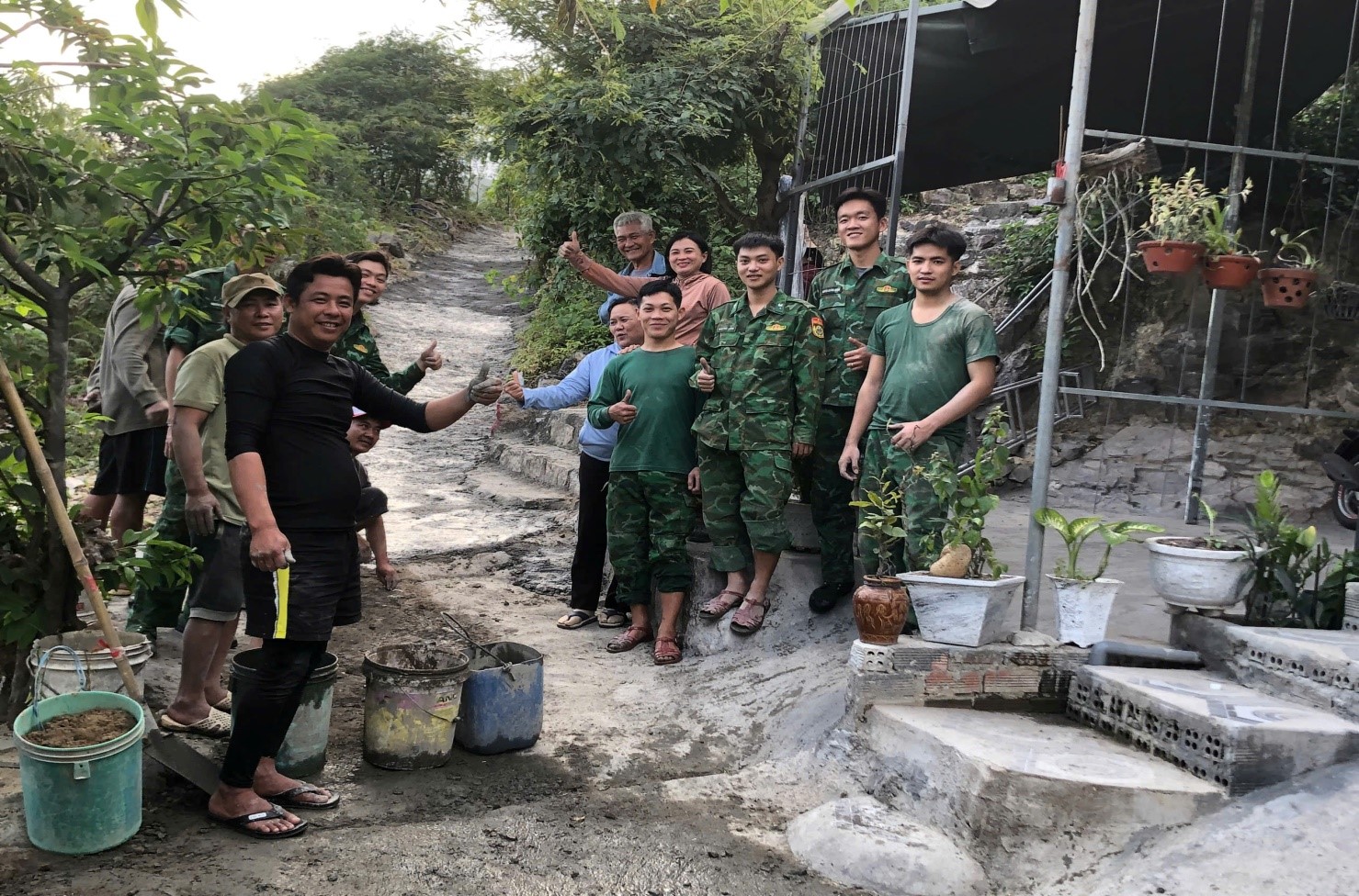Ban công tác mặt trận tổ, cán bộ chiến sĩ đồn biên phòng cửa khẩu Nha Trang và bà con nhân dân tổ 2 Trường Hải đã hoàn thành xong con đường.