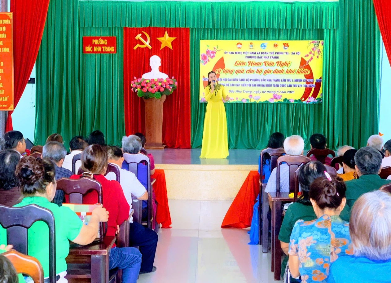 Sáng ngày 02/8/2025, UBMTTQ Việt Nam phường Bắc Nha Trang và các Hội - Đoàn thể chính trị - xã hội phường đã tổ chức chương trình giao lưu văn nghệ và tặng quà cho các hộ gia đình khó khăn nhân dịp chào mừng Đại hội Đại biểu Đảng bộ phường lần thứ nhất, nhiệm kỳ 2025-2030. Dự chương trình có bà Nguyễn Thị Trung Thu - Tỉnh uỷ viên, Bí thư Đảng uỷ, Chủ tịch HĐND phường.