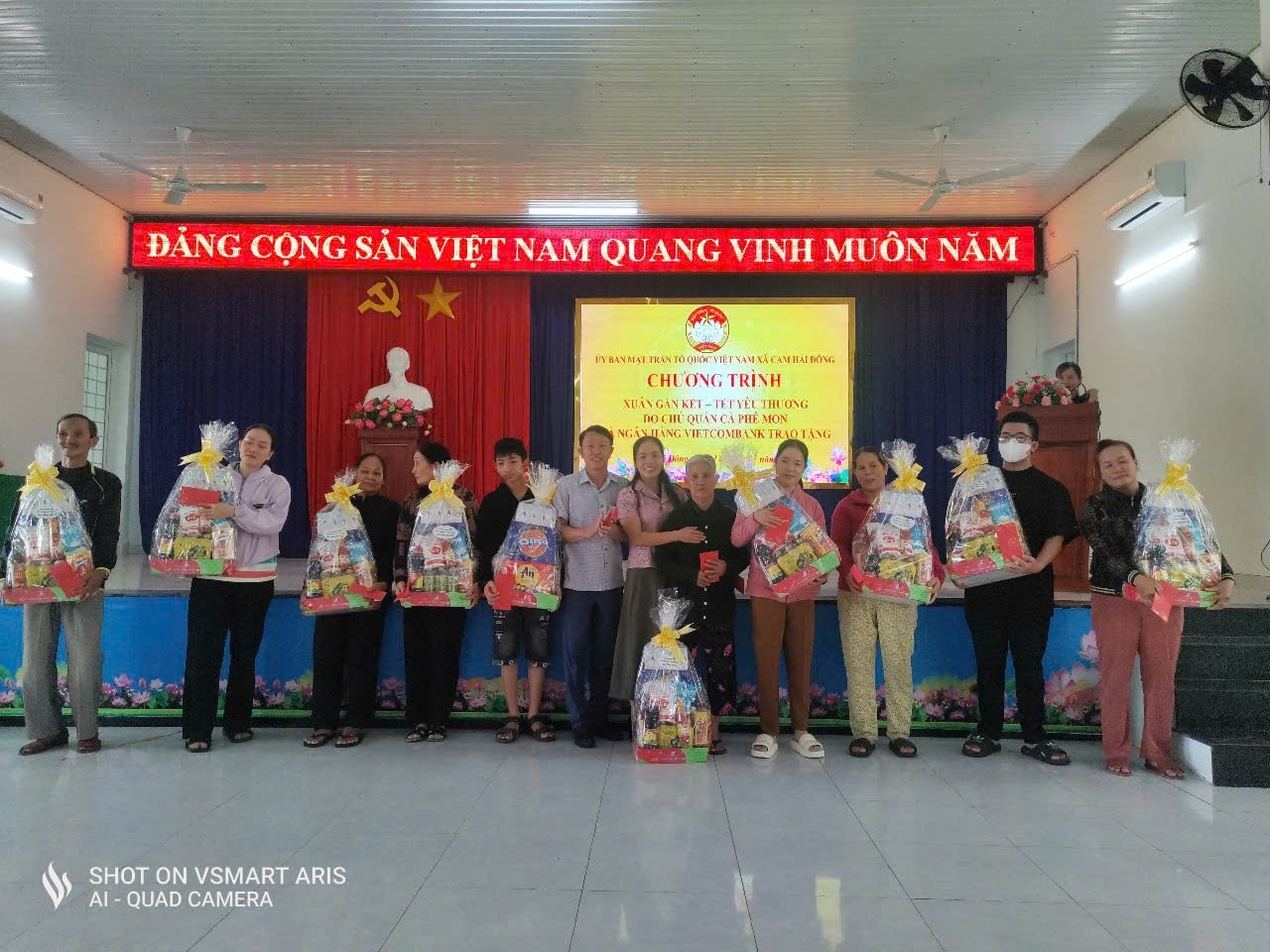 Tại chương trình “Xuân gắn kết - Tết yêu thương”, ông Trần Văn Hải và ông Trần Văn Hảo – Chủ quán Coffee Mon – Nhà hảo tâm, người sản sẻ yêu thương đã trao 35 phần quà cho 35 hộ khó khăn trên địa bàn xã – mỗi phần quà trị giá 500.000đ và UBMTTQ Việt Nam xã cũng đã trao 30 phần quà của Ngân hàng Vietcombank cho 30 hộ. Đồng thời bà Trần Thị Bích Hà – Chủ tịch UBMTTQ Việt Nam xã cũng đã lì xì thêm cho 30 hộ nhận quà của Ngân hàng Vietcombank mỗi hộ 01 phong bì lì xì 50.000đ.