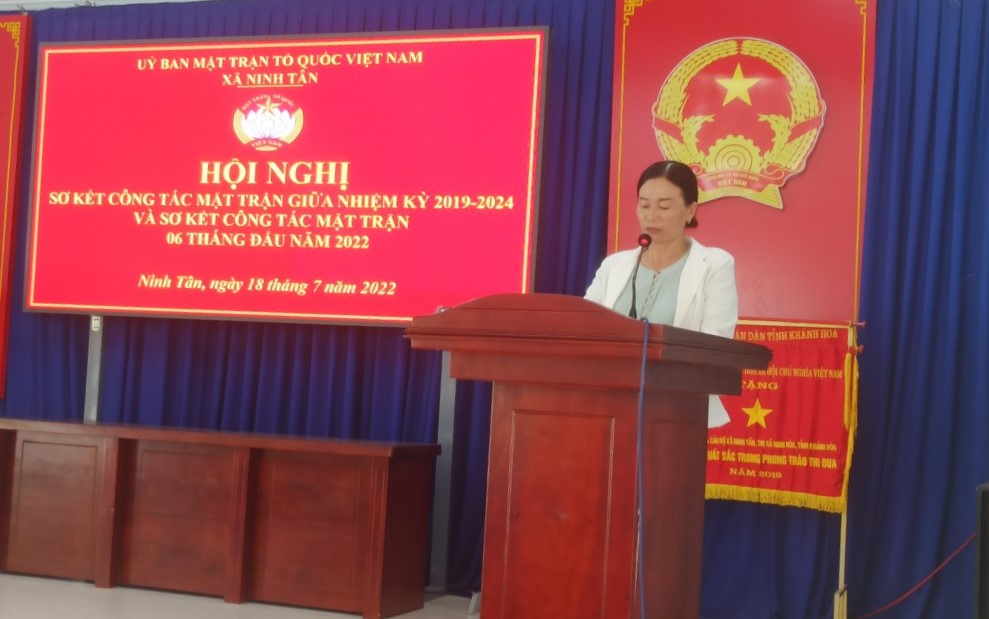 Đây là một trong những kết quả được đánh giá tại Hội nghị Sơ kết giữa nhiệm kỳ thực hiện Nghị quyết Đại hội Mặt trận Tổ quốc Việt Nam khoá IX và Nghị quyết Đại hội Mặt trận Tổ quốc Việt Nam các cấp nhiệm kỳ 2019-2024 và sơ kết công tác Mặt trận 6 tháng đầu năm 2022 của Ủy ban Mặt trận Tổ quốc xã Ninh Tân, TX. Ninh Hòa, diễn ra chiều ngày 18/7. Dự và chỉ đạo hội nghị có đồng chí Hoàng Văn Oanh, Bí thư Đảng uỷ, Chủ tịch Hội đồng nhân dân xã, các đồng chí Thường trực Đảng uỷ, đại diện lãnh đạo UBND, UBMTTQVN xã và các vị đại biểu là Ủy viên Uỷ ban MTTQ Việt Nam xã.