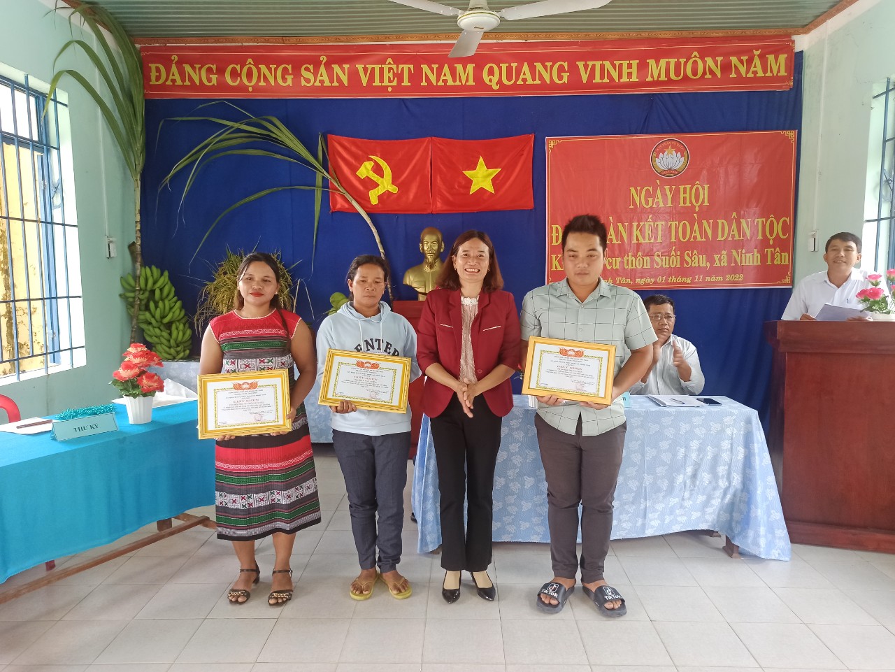 Sáng 01/11/2022, Khu dân cư thôn Suối Sâu, xã Ninh Tân, TX. Ninh Hòa long trọng tổ chức Ngày hội Đại đoàn kết toàn dân tộc khu dân cư năm 2022.Về dự Ngày hội rất vinh dự được đón tiếp các đồng chí lãnh đạo thị xã phụ trách địa bàn xã, các đồng chí lãnh đạo Đảng ủy, HĐND, UBND, đại diện các tổ chức chính trị - xã hội và hơn 90 đại biểu là bà con nhân dân trong khu dân cư.