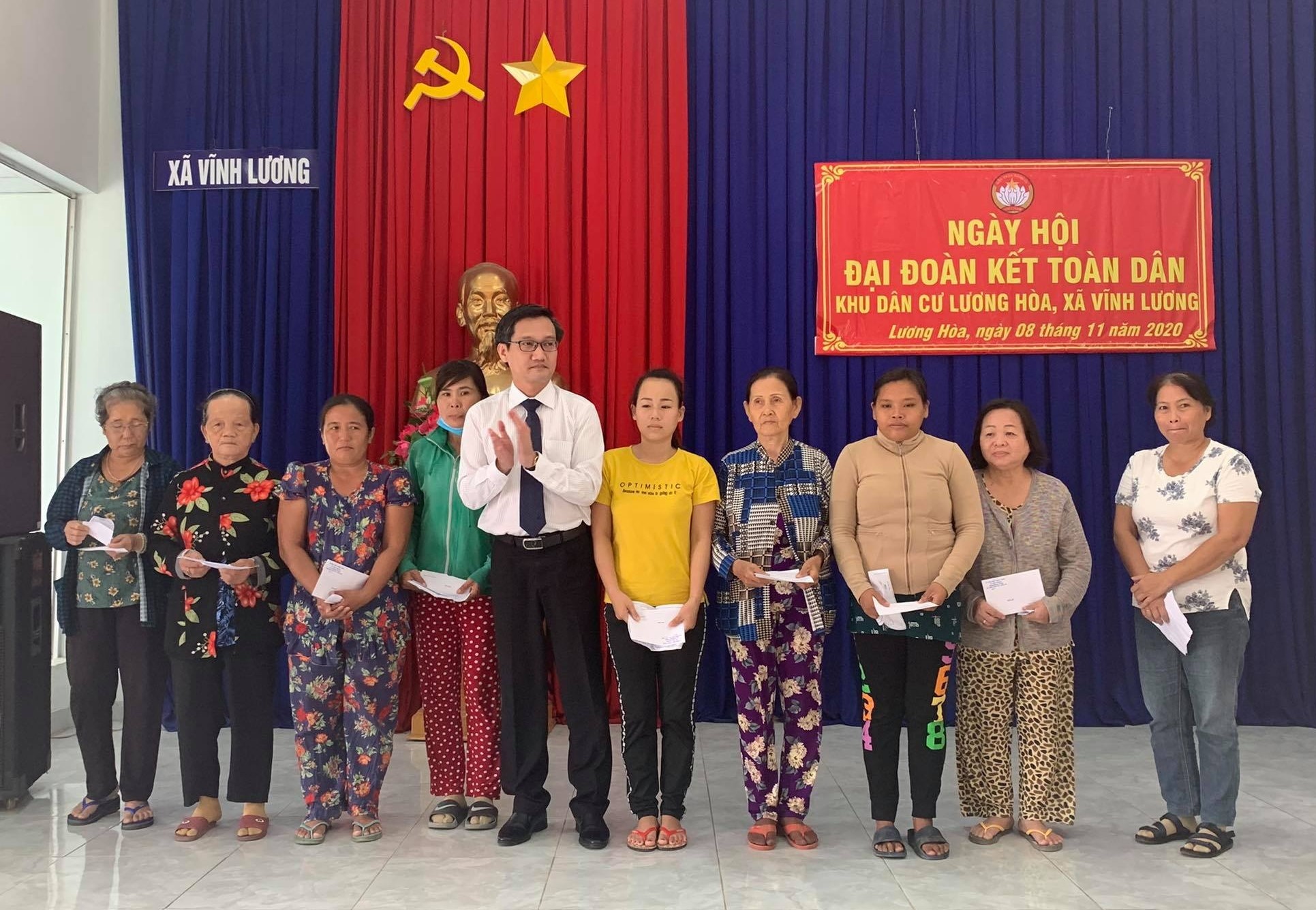 Nhân dịp này, ông Vũ Chí Hiếu - phó Chủ tịch UBND thành phố Nha Trang đã trao 10 xuất quà của thành phố, mỗi xuất 500 ngàn đồng và UBMT xã trao 3 giấy khen cho gia đình tiêu biểu và học sinh hiếu học, trao 25 xuất quà cho các gia đình hộ nghèo, cận nghèo, khó khăn đột xuất của thôn Lương Hòa.