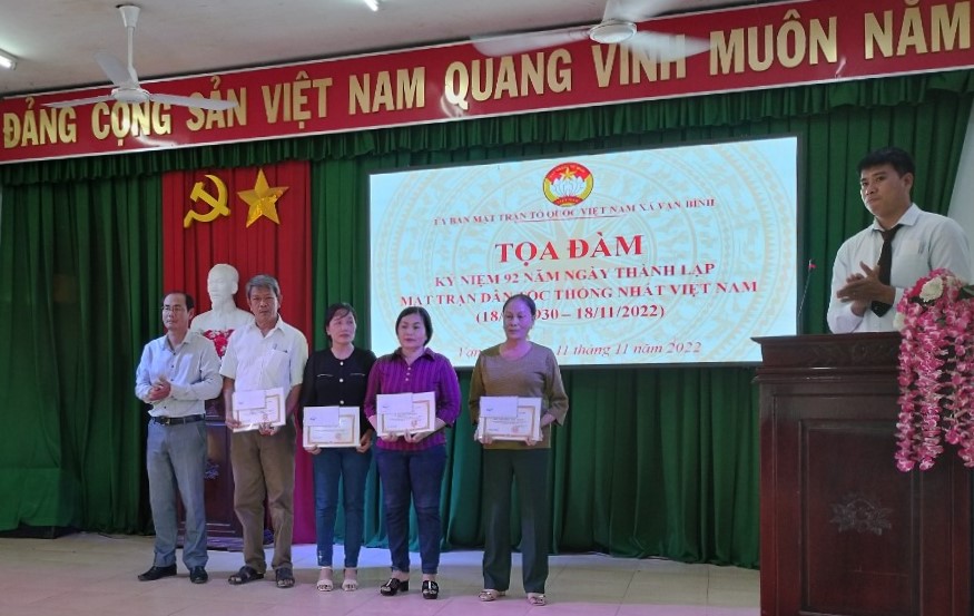Nhằm ôn lại Lịch sử ngày thành lập Mặt trận Dân tộc thống nhất Việt Nam, qua đó phát động phong trào thi đua yêu nước thực hiện thắng lợi mục tiêu của Đại Hội lần thứ IX của Mặt trận tổ Quốc Việt Nam đã đề ra, ngày 11/11/2022 UBMTTQVN xã Vạn Bình, huyện Vạn Ninh tổ chức buổi Toạ đàm kỷ niệm 92 năm ngày thành lập Mặt trận thống nhất Việt Nam 18/11/1930-18/11/2022.