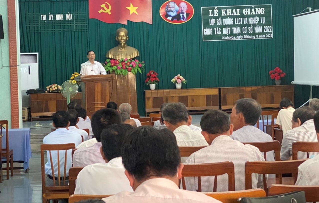 Nhằm bồi dưỡng Lý luận chính trị và nâng cao kỹ năng nghiệp vụ công tác Mặt trận cho cán bộ Mặt trận cơ sở trên địa bàn thị xã Ninh Hòa, sáng ngày 25-8-2022,Ủy ban MTTQ Việt Nam thị xã phối hợp với Trung tâm Chính trị thị xã Ninh Hòa khai mạc Lớp Bồi dưỡng Lý luận Chính trị và nghiệp vụ công tác Mặt trận năm 2022 cho cán bộ Mặt trận cơ sở.
